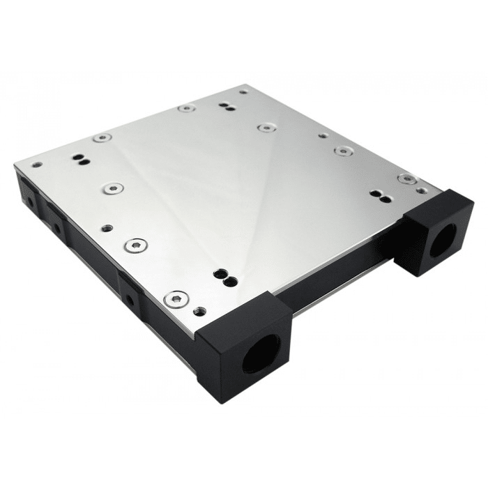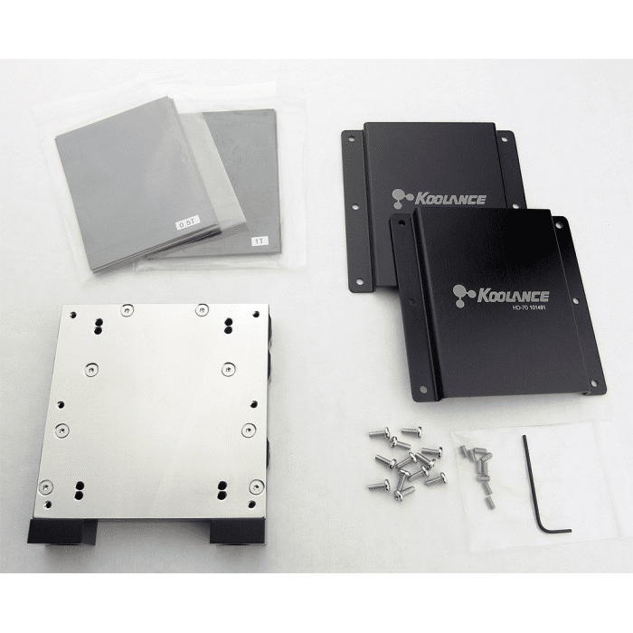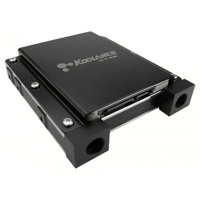 Koolance HD-70 est un bloc d’eau double face pour jusqu’à deux disques SSD de 2,5 pouces ou disques durs d’ordinateurs portables (non inclus). Les disques peuvent être orientés avec les connexions de données/alimentation face aux raccords de tuyaux ou à l’opposé, et sont fixés avec des supports en aluminium anodisé. Le bloc d’eau a la largeur d’un disque dur traditionnel de 3,5 pouces et est monté avec des vis sur les côtés.